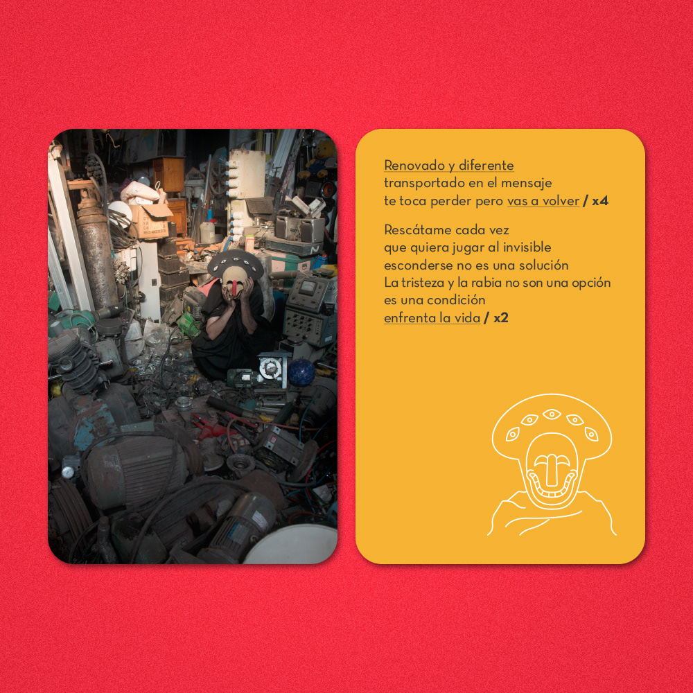 El empaque para CD contiene 9 postales fotográficas, 1 código de descarga y 1 sticker con la ilustración de una de las máscaras. / The CD package contains 9 photo cards, 1 download code and 1 sticker with the illustration of one of the masks.